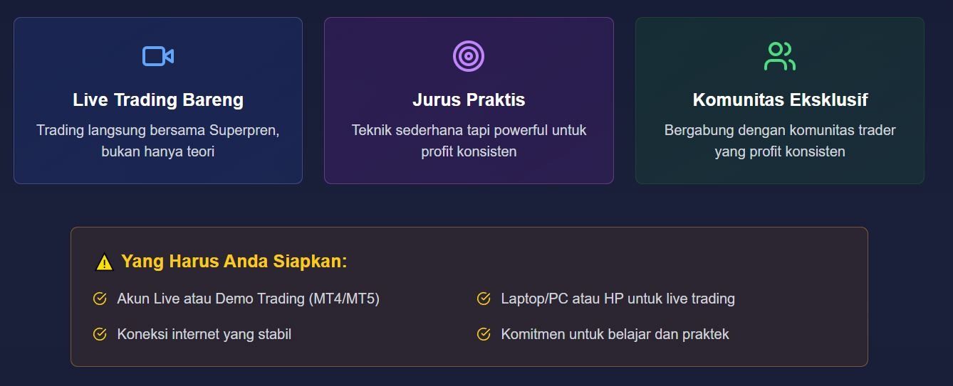 Superpren membantu trader pemula dan berpengalaman mencapai profit konsisten melalui live trading dan teknik praktis.